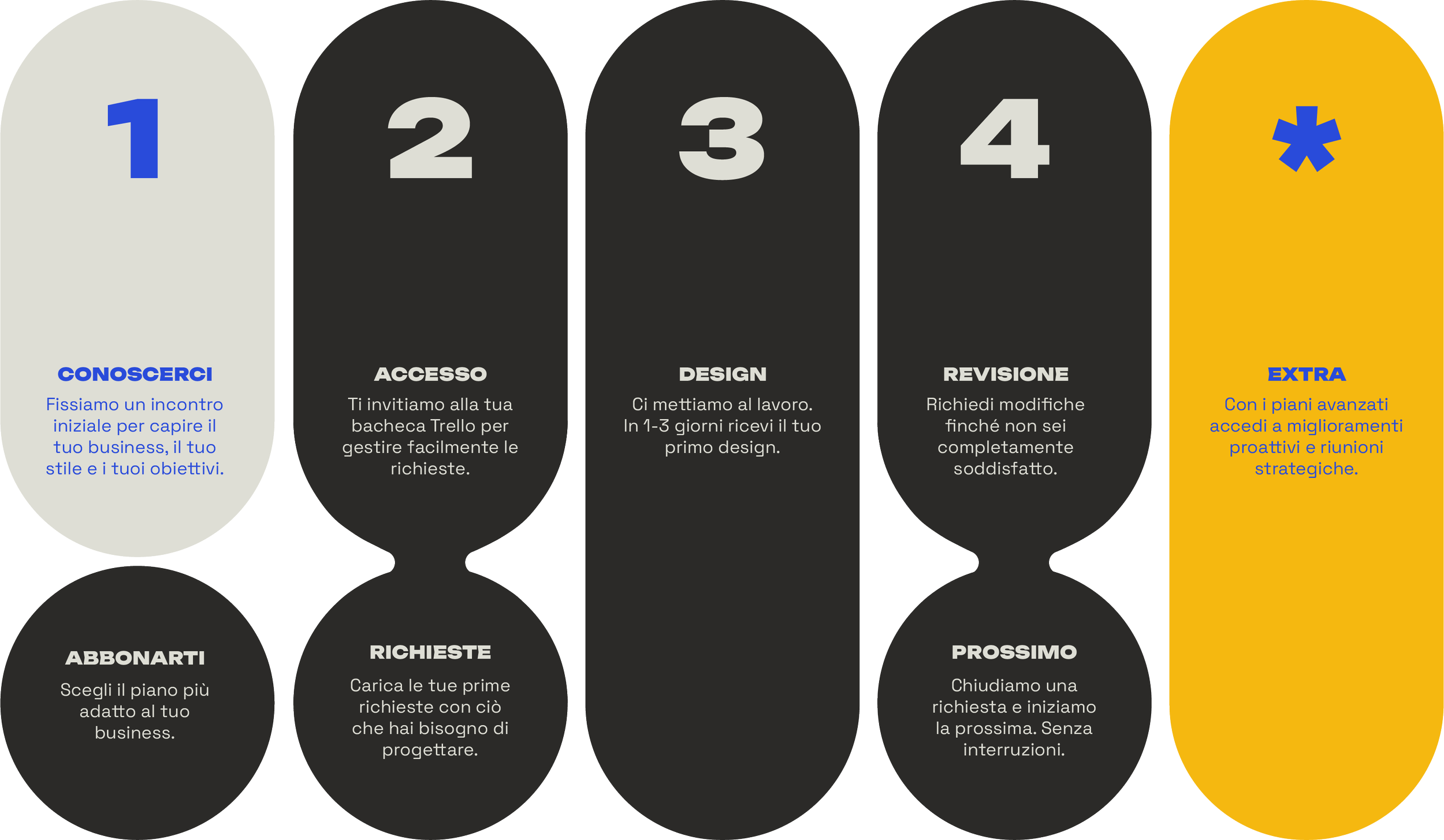 All’inizio ti chiediamo alcune informazioni chiave sul tuo brand. Poi puoi inviare richieste di design in qualsiasi momento. Le organizziamo e consegniamo una alla volta, secondo le priorità. Usiamo strumenti semplici per garantire un flusso di lavoro chiaro e veloce.